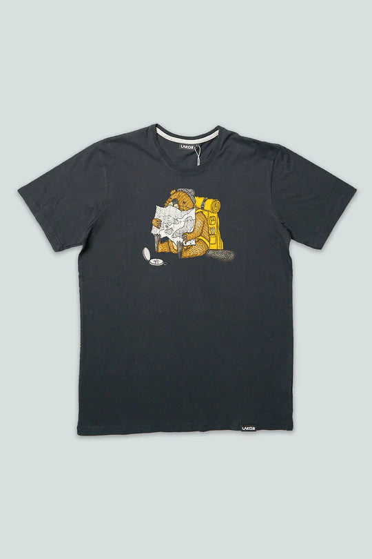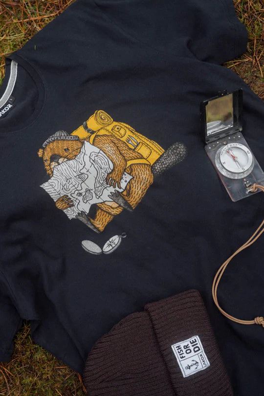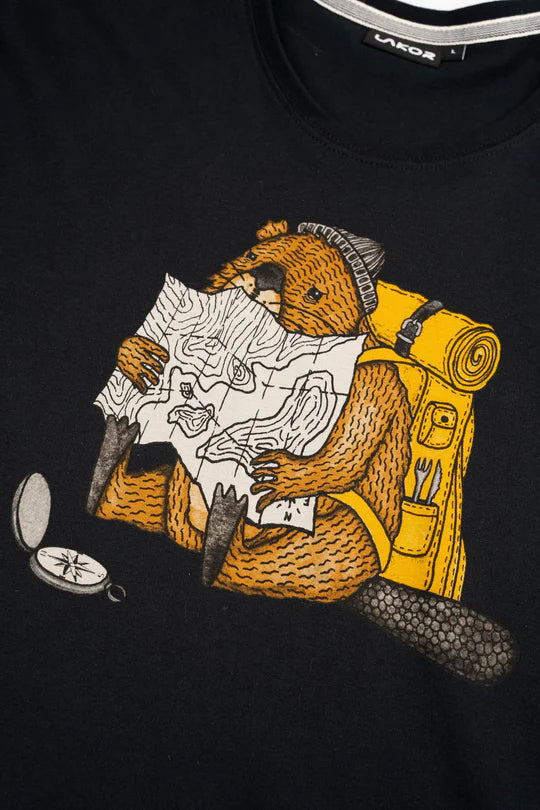 Indgangen til en bæverhytte er under vandoverfladen, og bævere er derfor fremragende til at navigere i vandet. På landjorden er alting mere bøvlet. På dette design ses en bæver i sekunderne før den, i en blanding af sult og frustration, æder sit landkort. #hangrybeaver