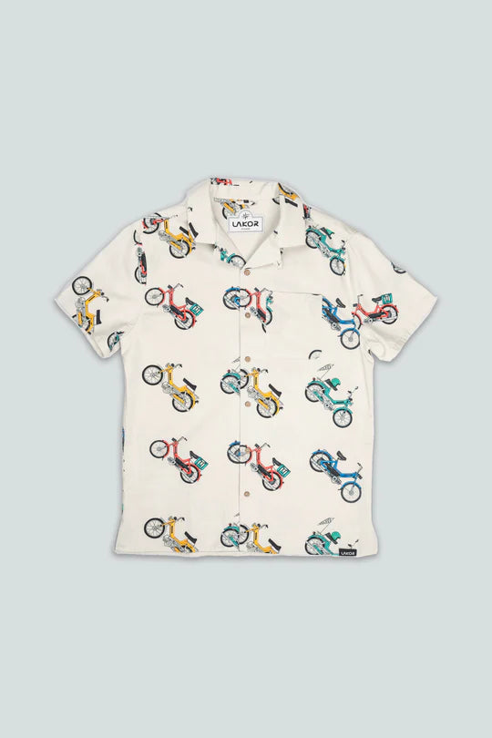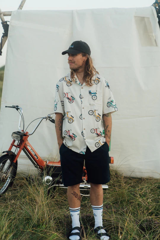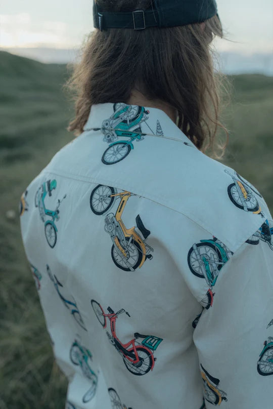 Denne skjorte vores svar på en hyldest til den elskede tohjulede opfindelse: Puch Maxien. Ikke bare et transportmiddel, men en livsstil. På skjorten er portrætteret en farvepalette af 80’er-ikonet, der er som skabt til at drøne mod kiosken efter Sport-Cola og Matador Mix. Det siges, at Puch Maxi’ens duft af kædeolie og kystlængsel stadig kan spores i stoffet – men det er muligvis blot en bivirkning af nostalgi. Træk i skjorten, og du er straks tilbage i en tid, hvor hjelmen sad løst, og fremtiden ikke var mere end landevej væk.